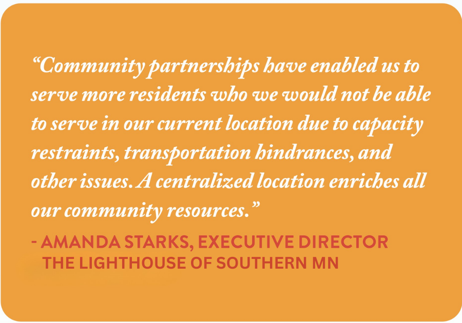 In addition to providing short-term housing, the Center will be a co-location resource center for agencies supporting many of the same families and individuals through different areas such as: housing, mental health needs, physical health needs, food and clothing resources, employment services, and more. Some organizations, such as The Lighthouse of Southern MN and Health Finders Collaborative, will base their operations from the shared site. Others, such as some county service providers, will have office space within Oak Hill Community Connections serving as a main location for their work.